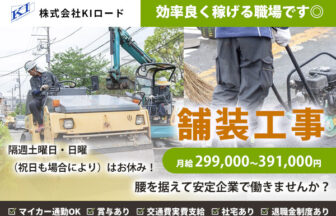 | 勤務時間 | (1)防水工事 (2)施工管理 8:00~17:00(実働8時間) ※現場により多少時間の前後あり ※基本残業なし 平均勤務日数:1ヶ月あたり19日 〜 23日 (3)事務員 勤務時間はご希望に応じます |