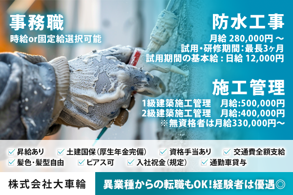 | 給料 | (1)防水工事 月給 280,000円 〜 試用・研修期間:最長3ヶ月 試用期間の基本給 : 日給 12,000円 (2)施工管理 1級建築施工管理 月給:500,000円 2級建築施工管理 月給:400,000円 ※無資格者は月給330,000円~ (3)事務員 時給or固定給選択可能 金額は経験・能力によるためご相談ください みなし残業込み 試用・研修期間:最長3ヵ月 試用期間の基本給 : 日給12,000円 |