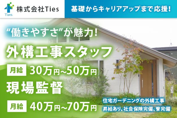 | 職種 | ①現場監督 ②外構工事スタッフ ③協力会社も募集中 |