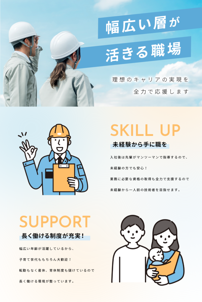 未経験の方でも安心してスタートできるよう、基礎から丁寧に指導する教育体制を整えており、工具の使い方や作業の流れなどを一つひとつしっかり教えていきます。現場では先輩スタッフがサポートするため、初めての方でも不安なく技術を身につけることができます。