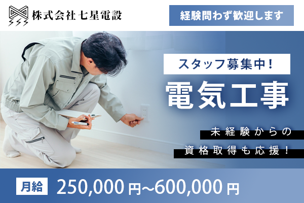 | 待遇 | ・未経験者歓迎 ・経験者優遇 <必須> ・普通自動車運転免許(AT限定可) <歓迎> ・第一種電気工事士 ・第二種電気工事士 ・職種問わず職人経験のある方 ・電気工事士の実務経験 |