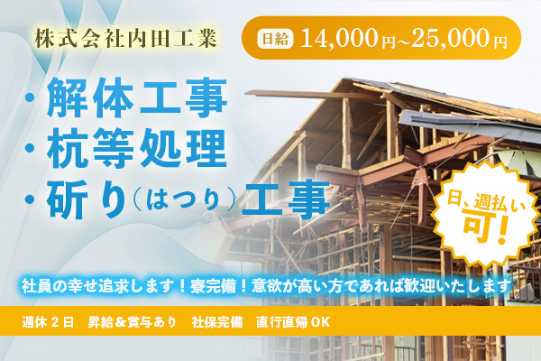株式会社内田工業は東京都で解体工事・斫り工事を行う会社です。ありがたいことに案件が増加しており新規スタッフを募集する…