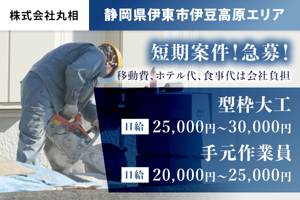 - ・型枠大工 日給:25,000円~30,000円 ※移動費、ホテル…