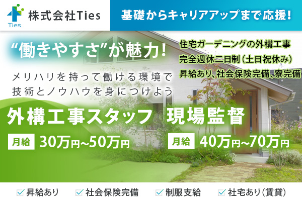 <未経験でも月給30万~!>経験不問!外構工事スタッフ募集中!株式会社Tiesは戸建住宅や集合住宅の外構・エクステリア工事…