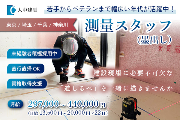 20代~60代の若手から中高年のベテランまで幅広く活躍中!未経験スタートOK◎新築工事の建築測量のお仕事です。まずは建築測量…